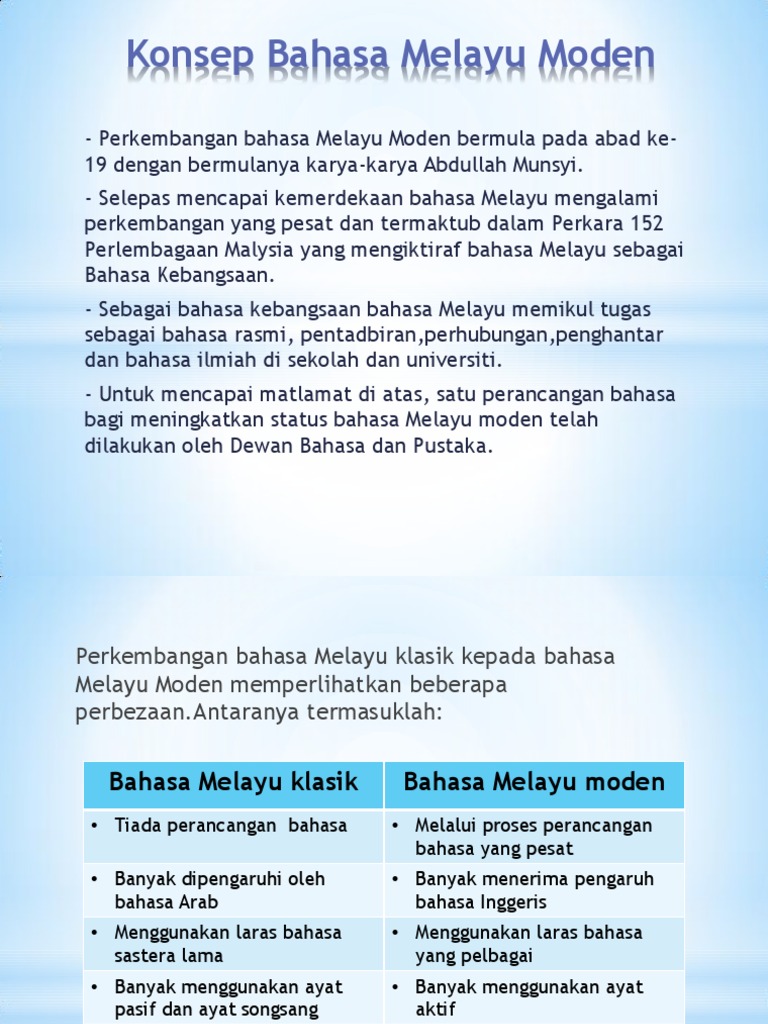 Bermula abad ke-19 dan ke-20. Lalu Hang Tuah memarang kepala dua orang yang mengamuk itu dan terbelah dua. SATU daripada ciri utama bahasa Melayu moden ialah bahasa itu memiliki pelbagai laras jauh lebih banyak daripada laras yang terdapat dalam bahasa Melayu klasik.